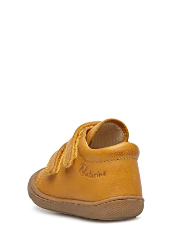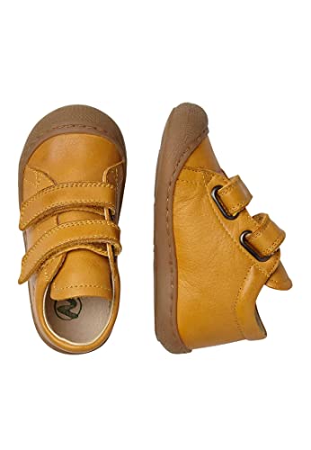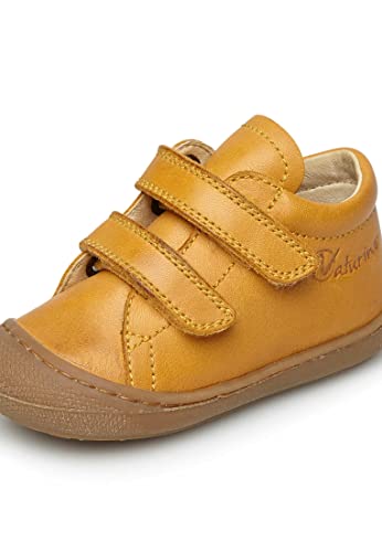 Kruipschoenen van pompoenkleurig nappaleer met dubbele klittenbandsluiting en leren voering. Het bovenmateriaal maakt de schoen superzacht, terwijl de lichte, flexibele rubberen zool is gemaakt voor de kleintjes die hun eerste stappen bewegen of op de grond kruipen. De versterkte teenkap ondersteunt de voet van het kind in deze zachte groeifase.