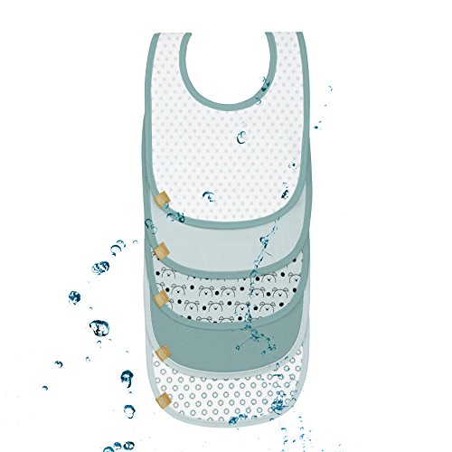 Met de praktische 5-delige slabbetjessets voor meisjes en jongens mogen kleine gourmets zonder spijt morsen – en dat meteen meerdere keren achter elkaar. De slabbetjes, die in een meervoudige sortering met klittenbandsluiting zijn uitgerust, zijn gemaakt van onderhoudsvriendelijk katoenmengsel en bevatten een passende waterdichte coating aan de binnenkant, zodat de kleding daaronder gegarandeerd droog blijft. Verkrijgbaar in verschillende kleuren met en zonder patroon. Geschikt voor baby’s en peuters vanaf 3 tot 18 maanden. De slabbetjes voldoen aan de eisen van Oeko-Tex Standard 100 en SHGO106392 Testex en zijn wasbaar op 40 °C.